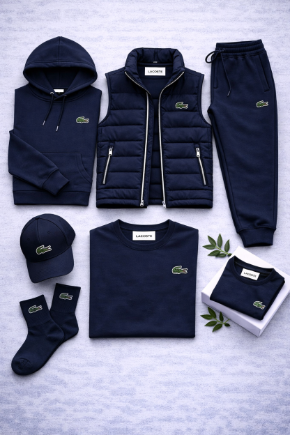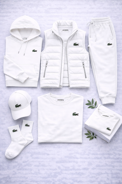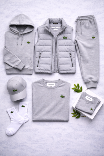 Le t-shirt conserve le même style épuré, idéal à porter seul ou sous le sweat, tandis que la casquette et les chaussettes complètent le look avec des détails coordonnés. Le logo Lacoste, discret mais reconnaissable, est présent sur chaque vêtement et ajoute une touche distinctive sans être envahissant.