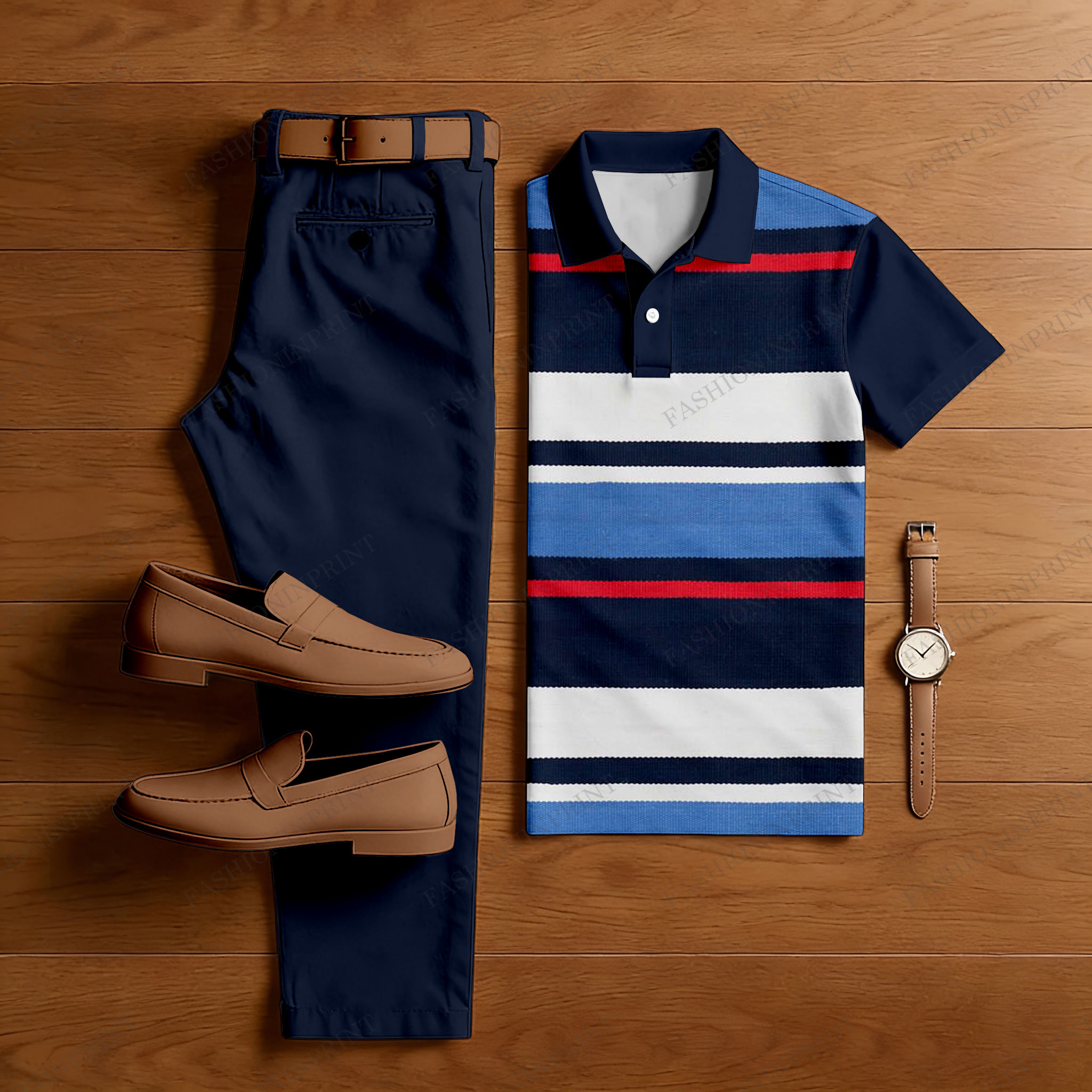 Men's Casual Navy Blue & Multi Color Matching Striped Printed Short Sleeved Polo Shirt & Trousers Two-Piece Set